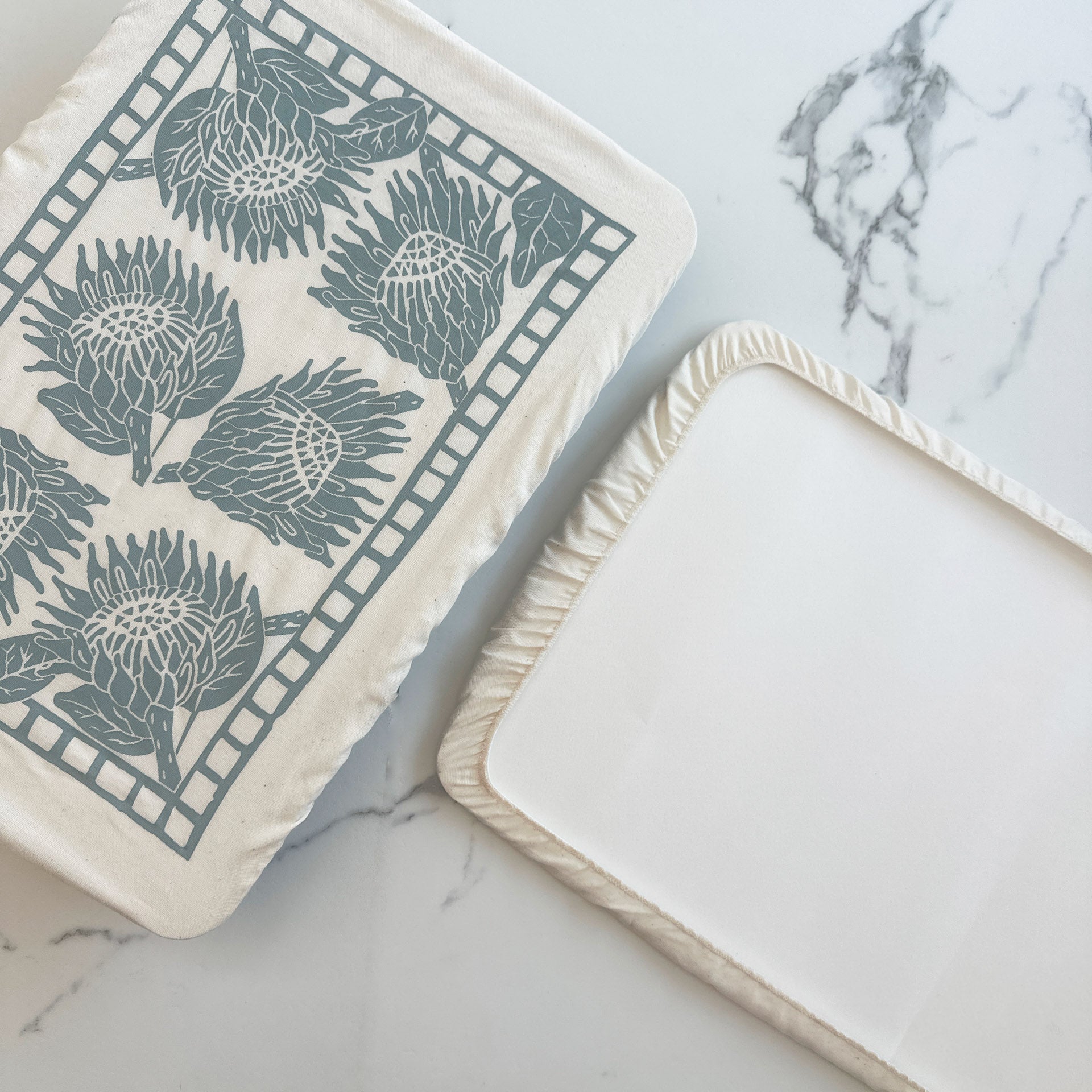 A set of three adjustable cotton rectangle dish covers to fit every casserole dish in your kitchen, saving you tons of single-use plastic wrap. The extra-large cover in Slate Green is perfect for a barbecue or pot luck, the lasagna pan size cover in Atlantic Blue, and the small casserole or loaf pan cover in Moss Green. Hand-printed in our classic Protea print, these covers are a long-lasting family favourite and a beautiful, functional gift.