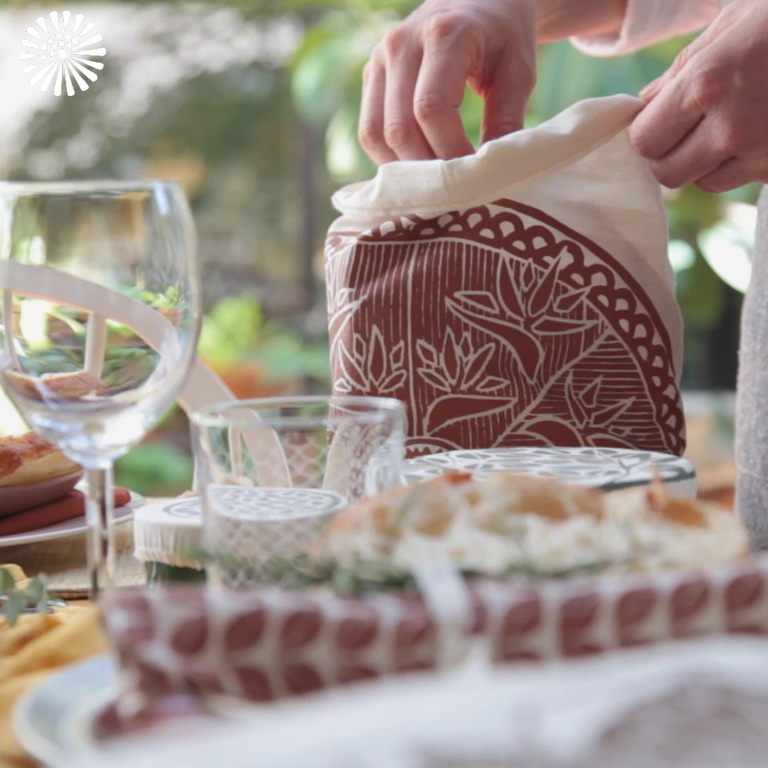Featuring a drawstring closure and hand-printed in navy or gold, this reusable bread bag is a beautiful and functional alternative to plastic or paper.