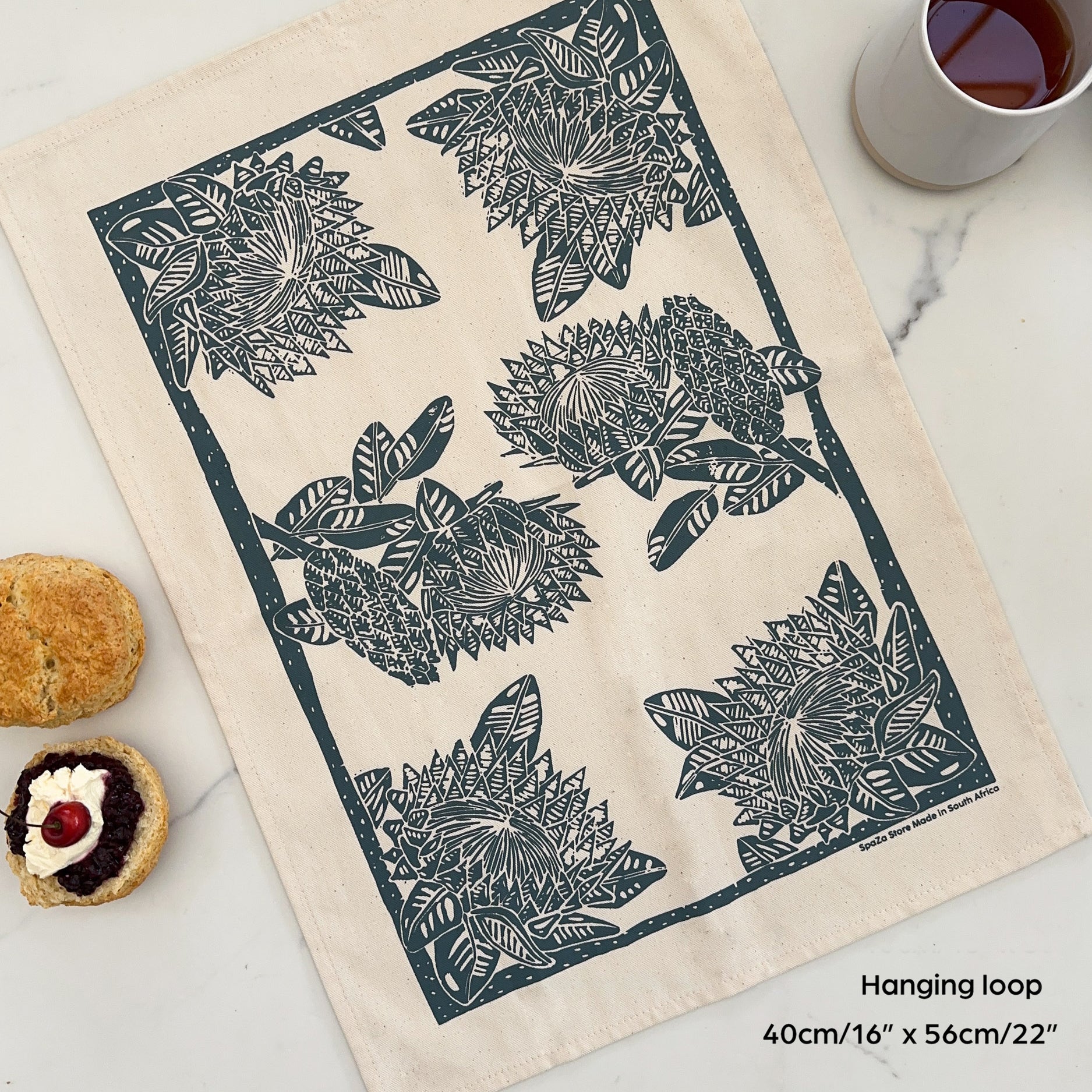 Paired with a beautifully printed Protea tea towel in rich blue-green color, this set brings both function and beauty to your daily routine.